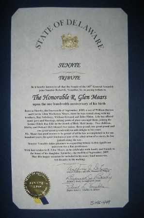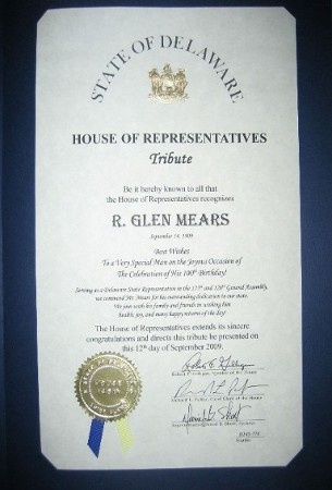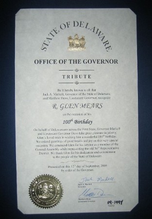 A highlight of the day was the presentation of birthday tributes from the Governor of the State of Delaware, the Delaware House of Representatives and the Delaware Senate.