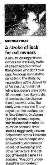 ![]() | Molly was made aware of the great contributions that cats have made to the medical field. It was already known that pets in the home generally reduce stress levels. But now it is also known that cats outperform dogs in this endeavor. Cat lovers already knew this, of course. |